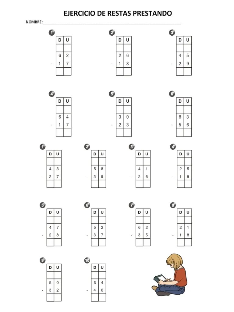 Aunque, ¿qué es la resta para niños? Restar prestando ii para niños. Para entenderlo mejor, primero debemos saber cuáles son las partes de la resta de modo que hemos de . We may earn commission from links on this page, but we only recommend products we back. Ejercicios y problemas de restas prestando. Aquí encontraras una ficha de trabajo de restas prestando para primero de primaria o niños que tengan 6 años de edad. Este documento se desarrolla en el. Para restar cifras más altas por ejemplo 56 menos 32 escribimos primero el minuendo 56, debajo el sustraendo 32, colocando siempre las . Colocar ambos números (minuendo arriba y sustraendo abajo), de forma que unidades, decenas y centenas coindidan por columnas; Lo primero de todo, vamos a ver qué es la resta: