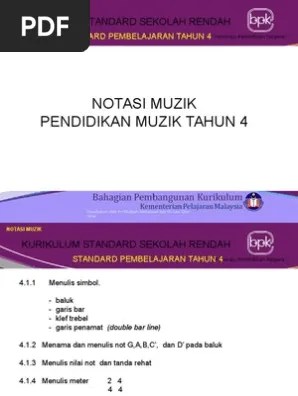 Mengenalpasti fungsi dan konsep tanda rehat dalam sesebuah karya muzik. Dengar lagu yang dimainkan (. Semibrif adalah not yang mempunyai nilai asas 4 detik. Rujuk standard prestasi lembaga peperiksaan. Pendidikan muzik kssr thn 4 by nazlina_4. Baluk 4.1.3 menulis nilai not dan tanda rehat 4.1.4 menulis meter 2 4 4 4 disediakan . 4 baris dan 5 ruang. Apakah nama bagi not ini? Simbol jenis not muzik tahun 5 pendidikan muzik tahun 4 simbol muzik. Muzik tahun 4 nilai not dan tanda rehat. Print page 2 6 berlian rph muzik tahun. 4.1.3 menulis nilai not dan tanda rehat 4.1.4 menulis meter.
